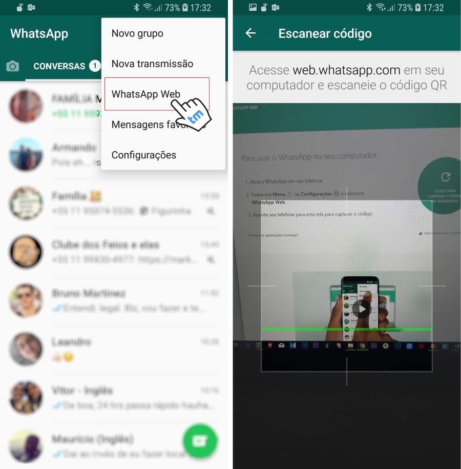 – Android: na aba de Conversas > Menu > WhatsApp Web.