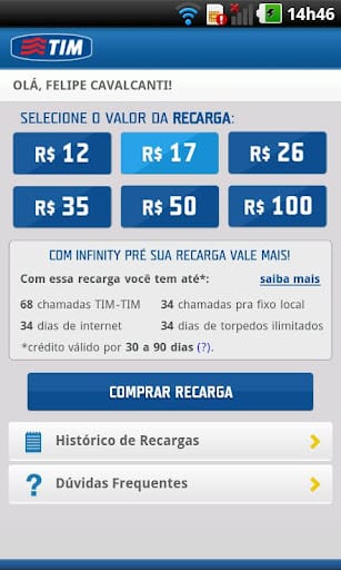 O aplicativo permite recargas nos valores de R$ 12, R$ 17, R$ 26, R$ 35, R$ 50 e R$ 100, além de realizar consultas no histórico de compras, para um melhor controle dos créditos.Usuários de planos de dados pré-pagos, como o Infinity Web Modem, também podem comprar créditos com a nova ferramenta. O download é gratuito e as transações no aplicativo não geram cobrança de tráfego de dados. Para efetuar a primeira recarga, o cliente deve preencher um pequeno formulário, dispensado caso o cliente já tenha se cadastrado no site da TIM.